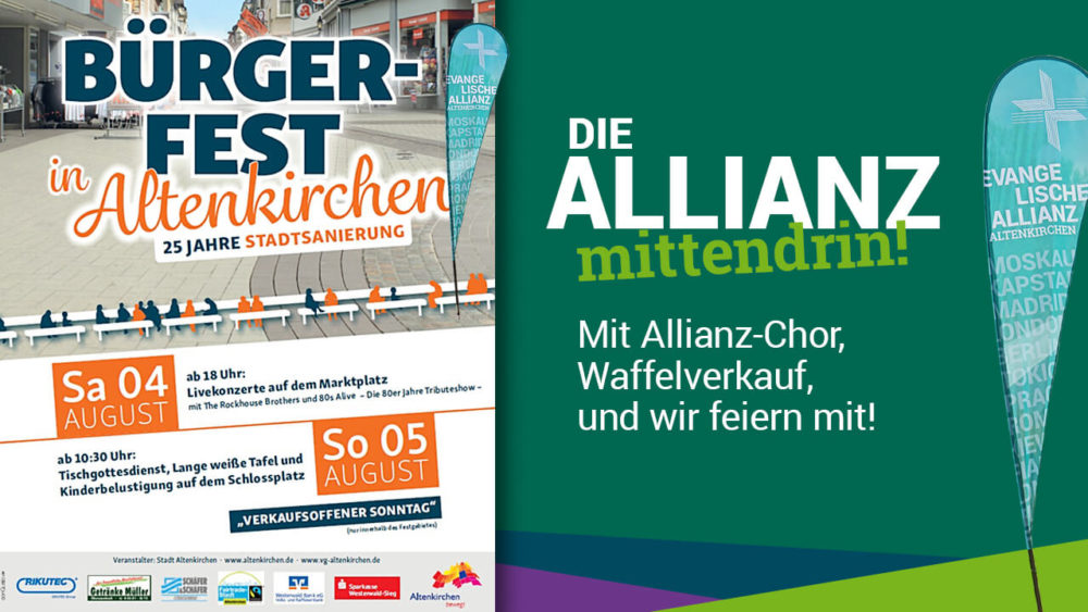 Wir würden uns freuen, wenn möglichst viele Christen am Gottedienst um 10:30 Uhr teilnehmen würden und damit, unabhängig von ihrer Denomination, ein Zeichen für Einheit und Frieden in Altenkirchen setzen.